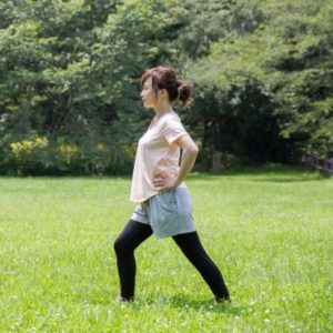 大きめに一歩下げるとアキレス腱が伸びますので、半歩引いて、ふくらはぎと膝裏がストレッチされることがポイントです。